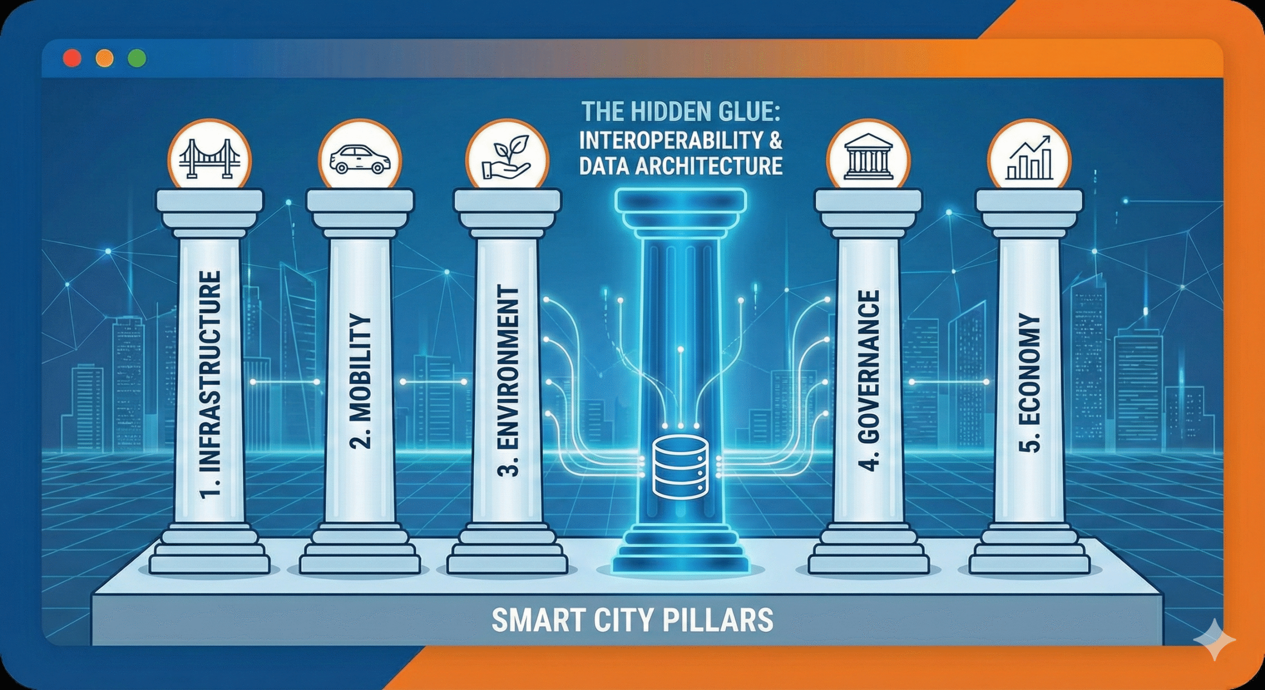 While the standard five pillars (Infrastructure, Mobility, Environment, Governance, Economy) remain relevant, they are useless without the “hidden” sixth pillar that holds them together: Interoperability & Data Governance.